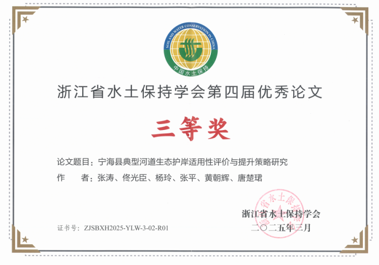 會(huì)議現(xiàn)場通報(bào)了2024年度生產(chǎn)建設(shè)項(xiàng)目水土保持方案優(yōu)秀單位、2024年度生產(chǎn)建設(shè)項(xiàng)目水土保持監(jiān)測優(yōu)秀單位,并為獲獎(jiǎng)集體進(jìn)行表彰。隨后,又現(xiàn)場表彰了浙江省水土保持學(xué)會(huì)第四屆優(yōu)秀論文評(píng)選結(jié)果。我院榮獲2024年度生產(chǎn)建設(shè)項(xiàng)目水土保持方案優(yōu)秀單位、2024年度生產(chǎn)建設(shè)項(xiàng)目水土保持監(jiān)測優(yōu)秀單位兩項(xiàng)集體榮譽(yù),并且以論文《寧??h典型河道生態(tài)護(hù)岸適用性評(píng)價(jià)與提升策略研究》獲得浙江省水土保持學(xué)會(huì)第四屆優(yōu)秀論文三等獎(jiǎng)。