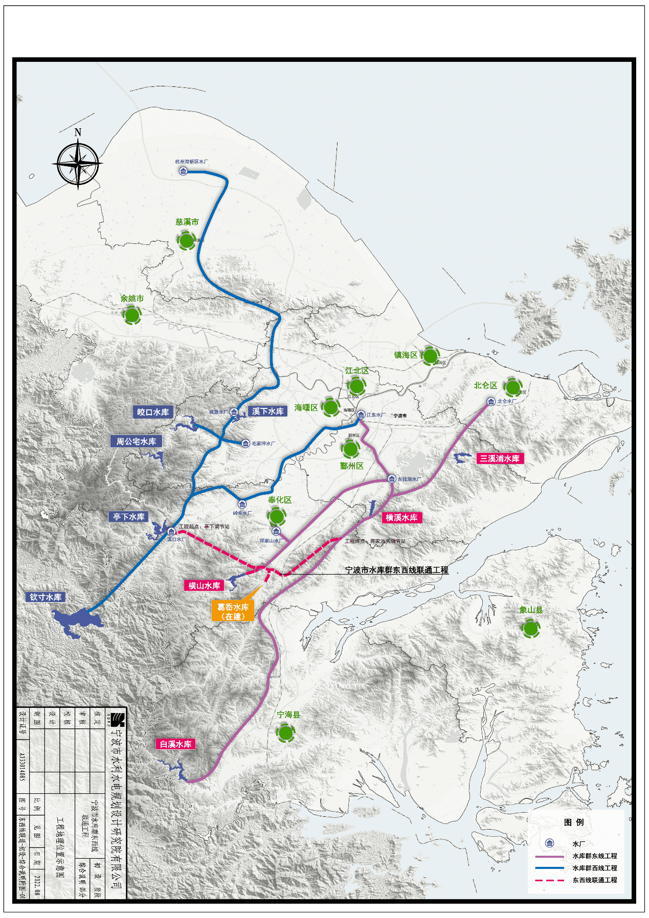 寧波市水庫群東西線聯(lián)通工程的測繪工作完成E級GPS控制點33個,特征高程點200個,三等水準測量約50公里;1:500地形測量約19.37平方公里,其中,陸域地形約17.61平方公里,水域地形約1.76平方公里;1:200水域橫斷面測量約3公里,1:500陸域縱斷面約4公里。