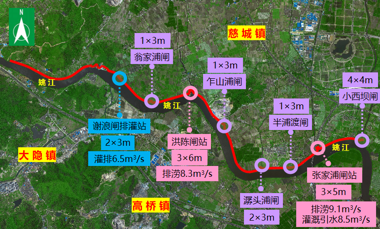 江北區(qū)姚江干流堤防維修加固工程(慈城段)位于寧波市江北區(qū)慈城鎮(zhèn),主要內(nèi)容為:整治堤防長度10.25km,新建閘站2座、水閘5座,維修加固排灌站1座。本工程在滿足防洪排澇的前提下,綜合考慮水利設(shè)施的造型美觀及河濱的綠化、休閑等,滿足人們親水及游樂的需求。