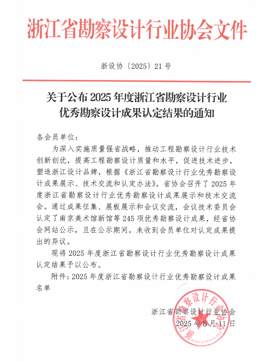發(fā)布日期:2025.08.26 近日,2025年度浙江省勘察設計行業(yè)優(yōu)秀勘察設計成果評選結果正式公布。由我院牽頭設計的“奉化江堤防整治工程鄞奉交界段”項目,繼榮獲寧波市優(yōu)秀勘察設計獎之... -