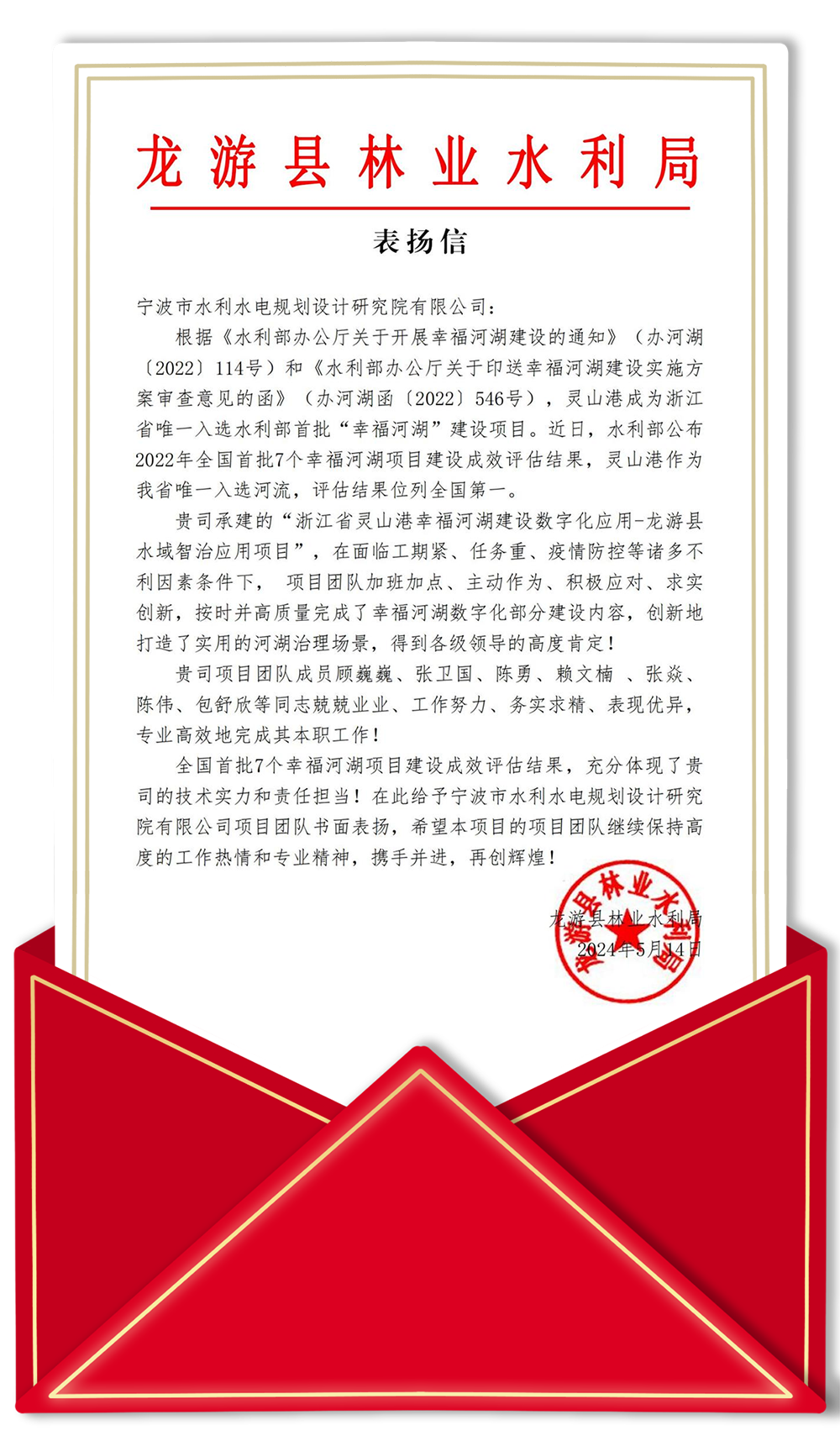 發(fā)布日期:2024.06.05 ? ? ? ?近日,我院收到一封來自業(yè)主單位衢州市龍游縣林業(yè)水利局的表揚信。信中提到:我院在承建“浙江省靈山港幸福河湖建設(shè)數(shù)字化應(yīng)用-龍游縣水域智治應(yīng)用項目”的過... -